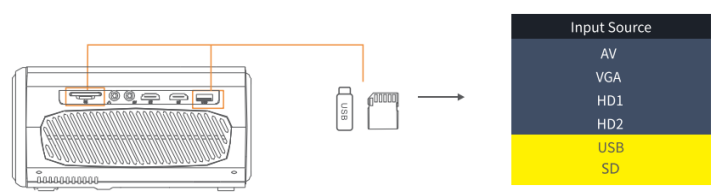 In addition to standard picture files like JPG and PNG, the projector supports popular video formats including MP4, AVI, and MKV. Additionally, it can play audio files from external devices or USB drives.