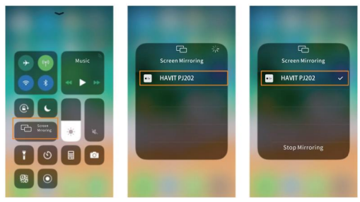 - Click AirPlay/Screen mirroring on your phone and connect to “HAVIT PJ202”.