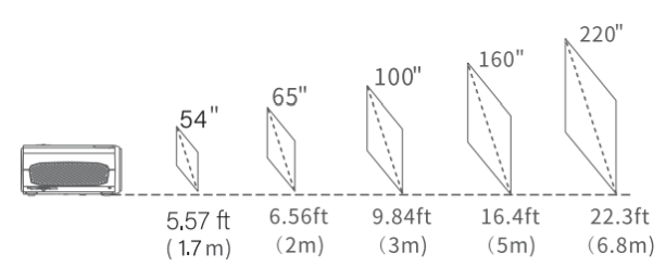 The ideal diagonal screen size for the PJ202 is between 30 and 150 inches. Depending on the screen size and lighting conditions in the room, the ideal projection distance is usually between 4 and 16 feet (1.2 and 5 meters).