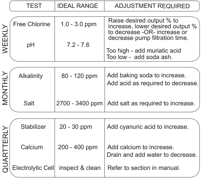 Test your water periodically. Your Authorized AquaRite Dealer or most pool stores can provide you with the chemicals and procedures to adjust the water chemistry. Be sure to tell the pool store that you are using an AquaRite chlorine generator.
