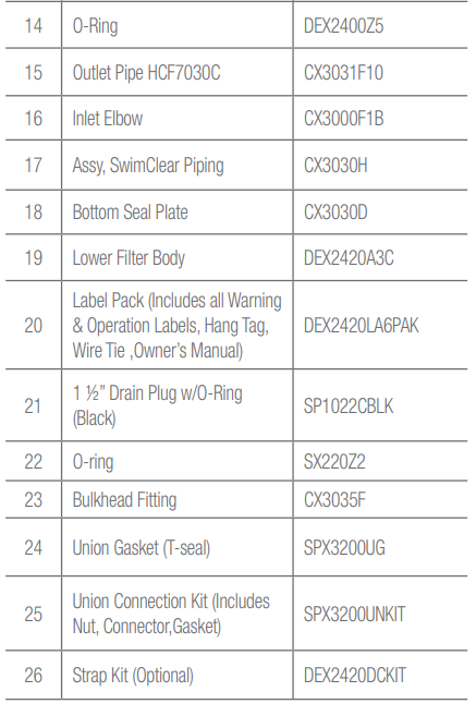 - Use ONLY Hayward clamp system components: DEX2421JKIT clamp assembly, DEX2421J2 nut/bolt assembly, and a DEX2422Z2 metal reinforced seal. Non-Hayward components may fail in use and cause explosive separation.