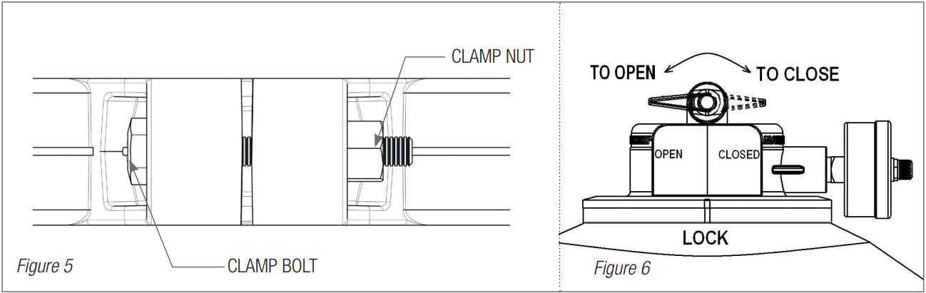 - Using 3/4” wrenches or hex sockets, loosen and remove the clamp nut and the clamp bolt. (Fig 5)