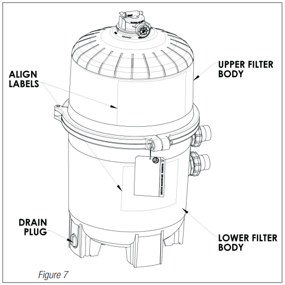 - Replace the filter clamp around the upper and lower filter bodies. Hold the clamp ends to position the clamp on the filter bodies with the clamp ends adjacent to the safety and operation labels on the filter bodies. (Fig 7)