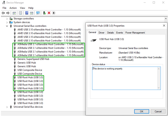 - If the driver is installed properly, four “ASMedia USB 3.1 eXtensible Host Controller” and four “USB Root Hub” entries should be displayed.