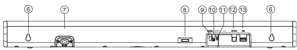 Play/pause/resume playback in Bluetooth/ USB mode. Press and hold to activate the pairing function in Bluetooth mode or disconnect the existing paired Bluetooth device. - SURR