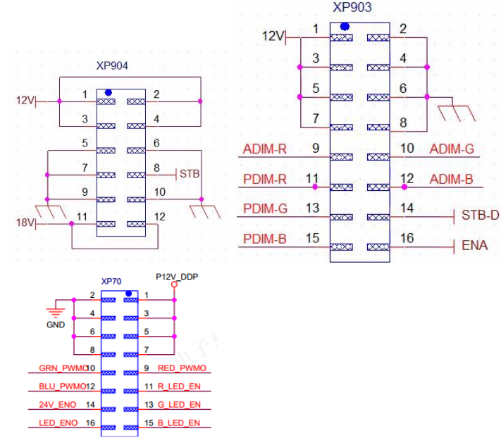 - Pins 9, 10, and 12 are the R, G, and B analog dimming pins (current adjustment pins) that the display board outputs to the power supply board, and the maximum is 5V.