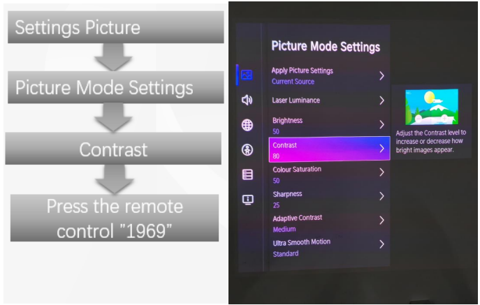 - Move and “ok “button on RC to select settings–picture-advanced settings-contrast