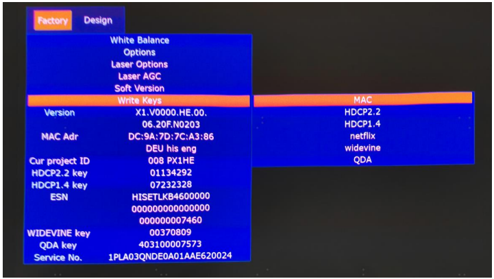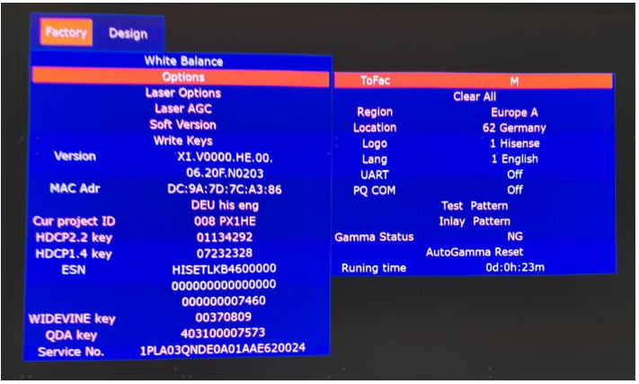 - Call up an “M” on the left-top of Laser Cinema, then press the button again, the Factory menu appears then.