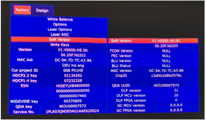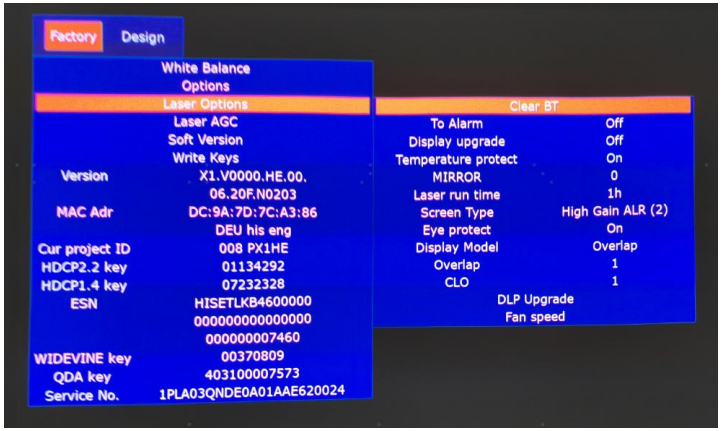 Factory OSD menu list: if you want to learn more about Laser Cinema, you’d better read it, but do not adjust the value, please. The Factory menu may have differences for diverse markets and customers.