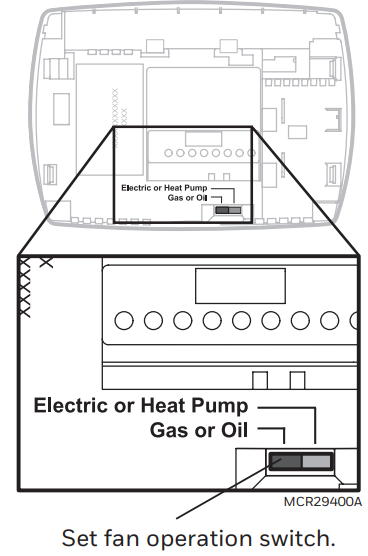 Gas or Oil: For gas or oil heating systems, leave the fan operation switch in this factory-set position. (This setting is for systems that control the fan in a call for heat.)