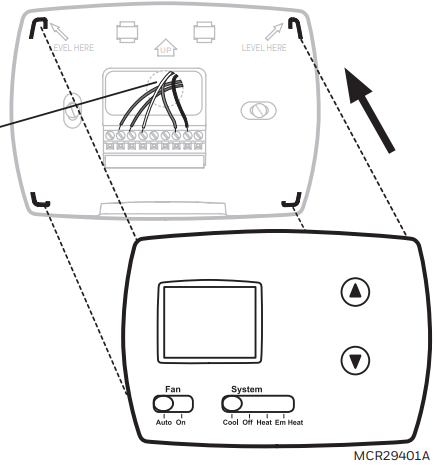 - Align the 4 tabs on the wallplate with the corresponding slots on the back of the thermostat.
