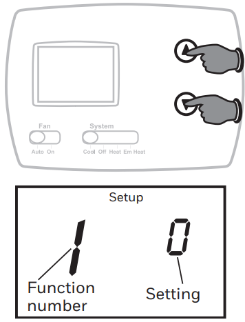 0 Heat and fan turn off. 1 Heat turns on. 2 Auxiliary heat turns on (TH3210D only). - 20 Emergency heat