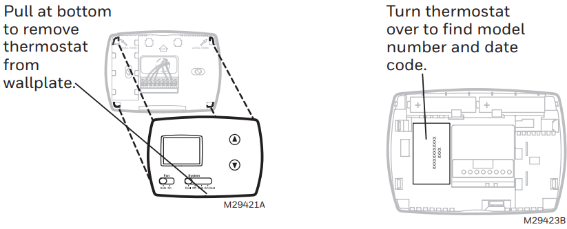 Remove the wallplate from the thermostat by pulling from the bottom, then follow the directions below for mounting.