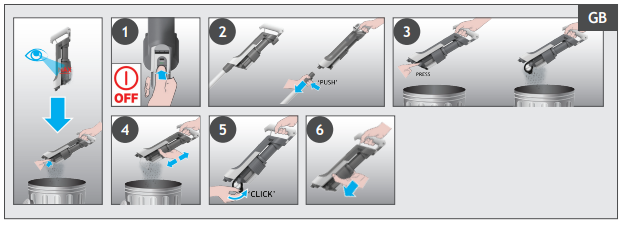 - Hold the handheld over a Dust Bin and press the Dust Bin Empty Release Button to open the flap and release the debris into the trash.