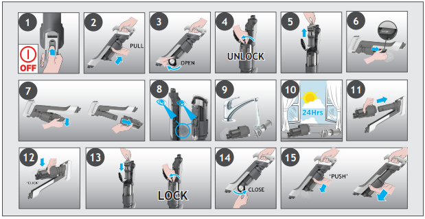 - Detach the nozzle, tube, and handheld unit as per previous instructions.