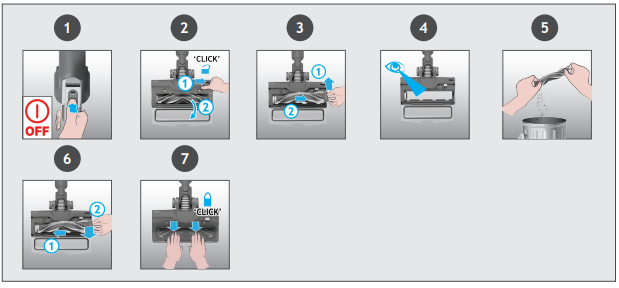- Attach the bin, sliding it upwards on the main unit until you hear a “click” sound.