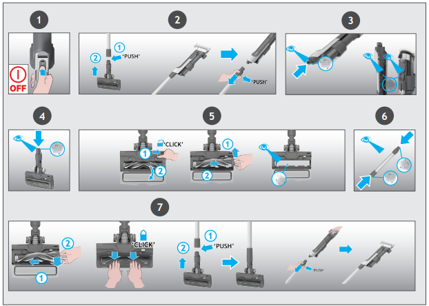 - Fit your desired accessory to the end of the handheld unit; all of your available accessories will fit onto the end of the handheld unit. You can also use the Integrated Crevice tool.