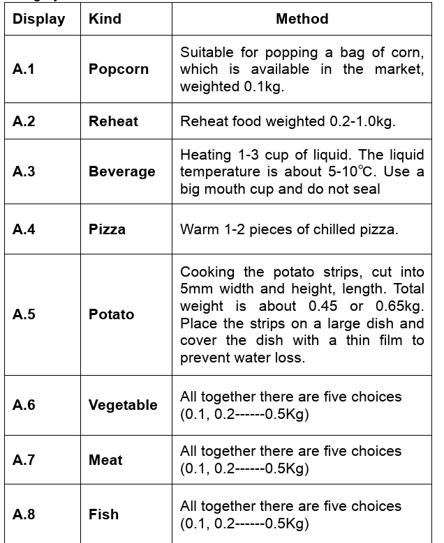 - The oven has a default cooking menu for simple operation. When the LED flashes colon, turn the Auto Cooking knob, and the LED will cycle to show A.1, A.2 …… A.8 Choose the appropriate menu according to the food type and weight, and strictly observe the directions in the table below; otherwise, the cooking effect will be largely influenced.