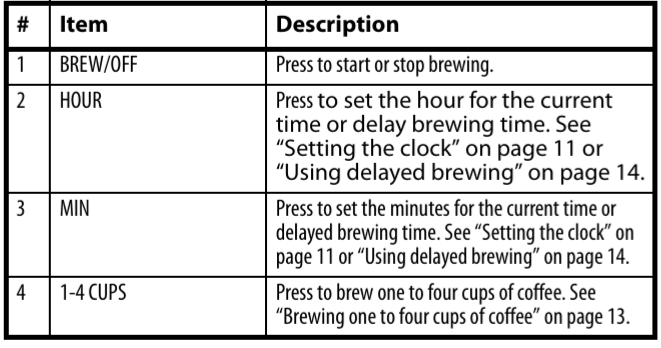 - BREW NOW to start brewing coffee. See “Brewing coffee” on page 11.