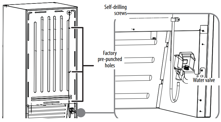- Secure the water inlet tube to the back of the refrigerator with two of the provided chrome head screws with washers.