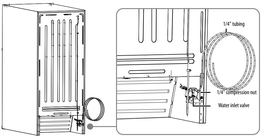 - Coil the excess water supply line (about 2-½ turns) behind the refrigerator and arrange the coils so they do not vibrate or wear against any other surface.