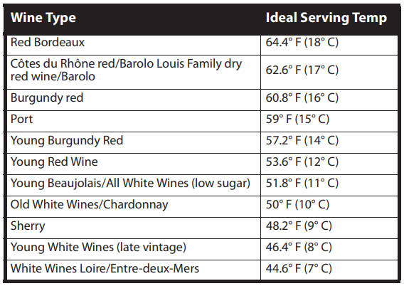 We suggest that you pour wine at a temperature below the ideal serving temperature, because the wine warms up quickly after it’s been poured into a glass.