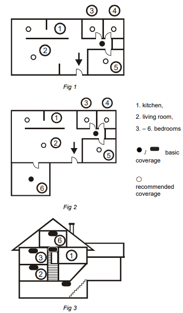 In buildings and family houses with multiple floors, detectors should be installed above stairwells. It is recommended to place additional detectors in rooms where people sleep.