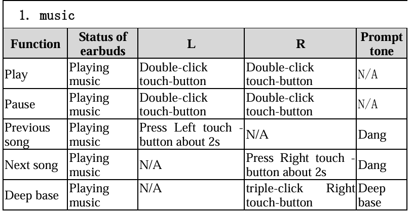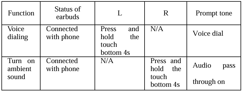 - If the earbuds are powered off, you should press the touch-button for about 3s until the blue LED flashes, at the same time the earbuds emit “Power on”. Then release. This is now in the “Power on” state.