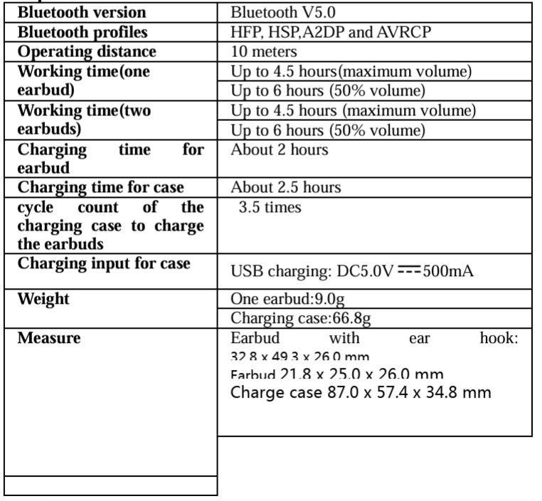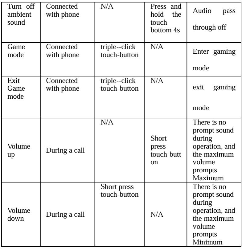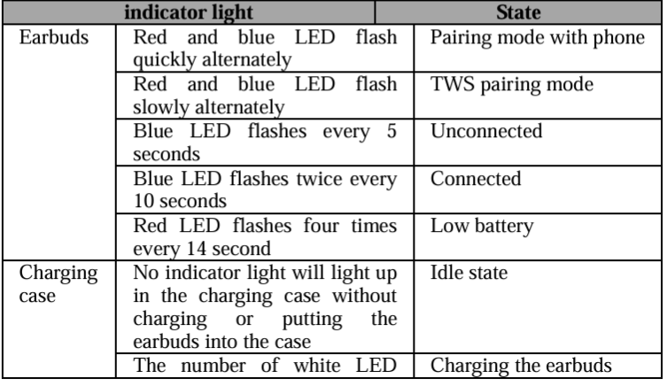 - Connection method: Operate any earphone to enter the pairing mode and pair with the mobile phone, then turn on the other earphone or take it out of the charging box.