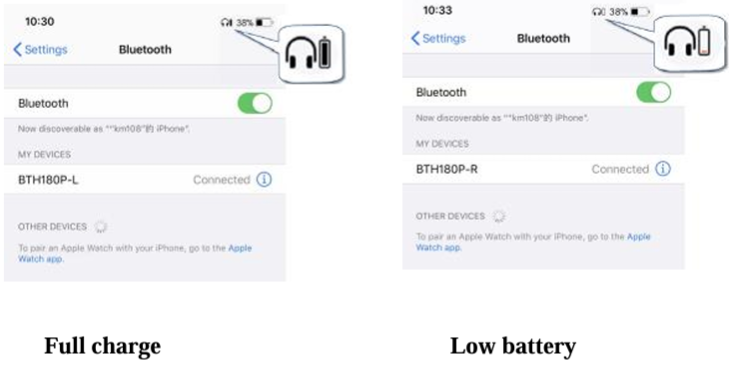 When the earbuds are low on power, the battery indicator will turn red and show a depleted battery icon. For different phones, there may be different ways to display the battery life on the phone. The following is a screenshot of the battery life on the iOS phone.