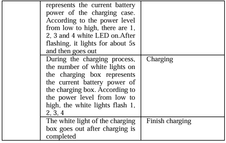 - When the indicator of the charging case has only one white light on, it means the battery of the charging case is low.