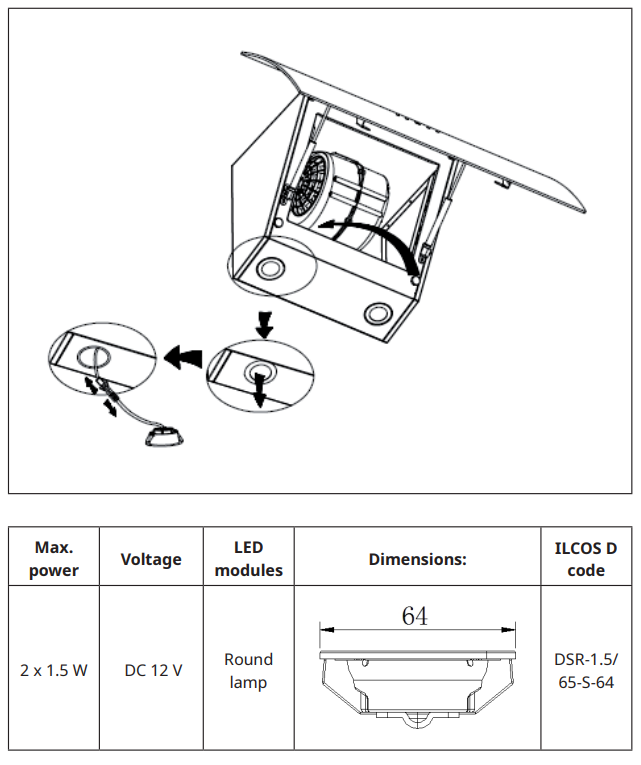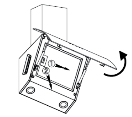 - Open the glass cover and remove the grease filter. Put one hand into the cavity and carefully push out the LED light. Pull the light out from the outside with the other hand. Dismantle the lamp cable connector and remove the lamp.
