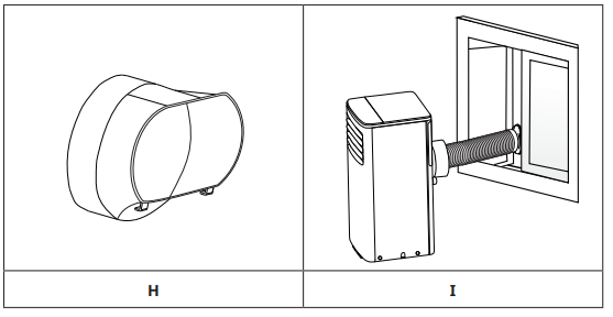 - Remove the unit with the packed exhaust duct next to the window, and then connect the adaptor B (flat mouth) of the exhaust duct to the window. (Fig.E)