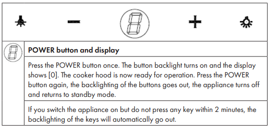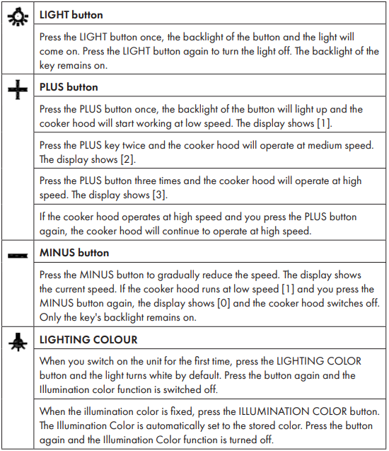 - After you have connected the cooker hood to the mains, all of the buttons light up briefly.