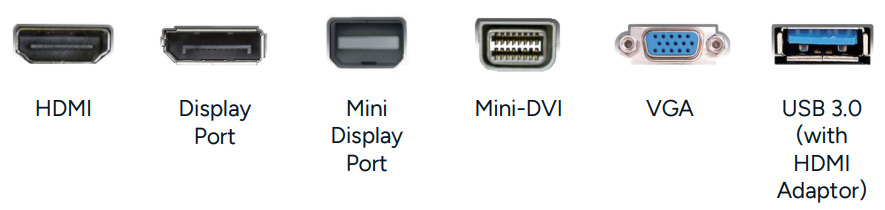 - Identify your laptop’s available video output port (e.g., DisplayPort, Mini DisplayPort, Mini-DVI, or VGA).