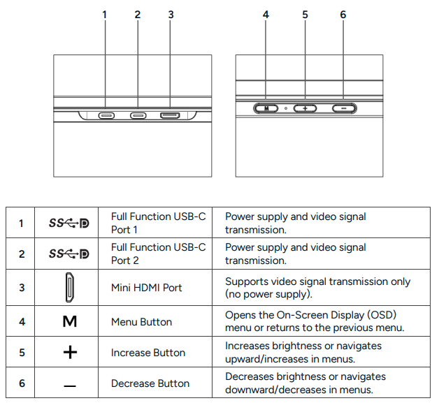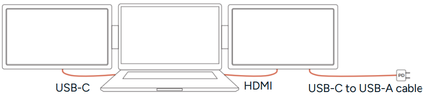 | No Thunderbolt/USB-C with DP support, but with HDMI. | One HDMI to Mini-HDMI cable. One USB-A to USB-C cable. |