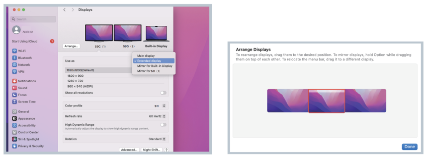 - Click the monitor’s name to choose ‘Mirror’ or ‘Extended’ display mode.