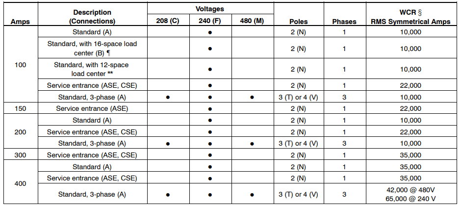 - ASE: Service entrance rated CSE: Service entrance rated with CSA certification (not available for 150 amp models) 0100: 100 amps 0150: 150 amps 0200: 200 amps 0300: 300 amps 0400: 400 amps