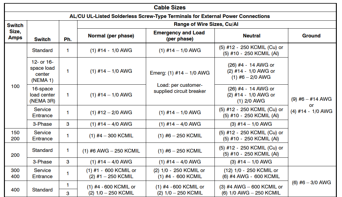 Service Entrance Transfer Switch Ratings