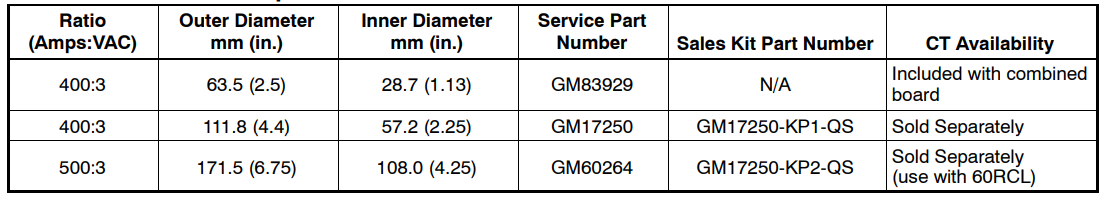 - See the table below for current transformer specifications and optional kit numbers.
