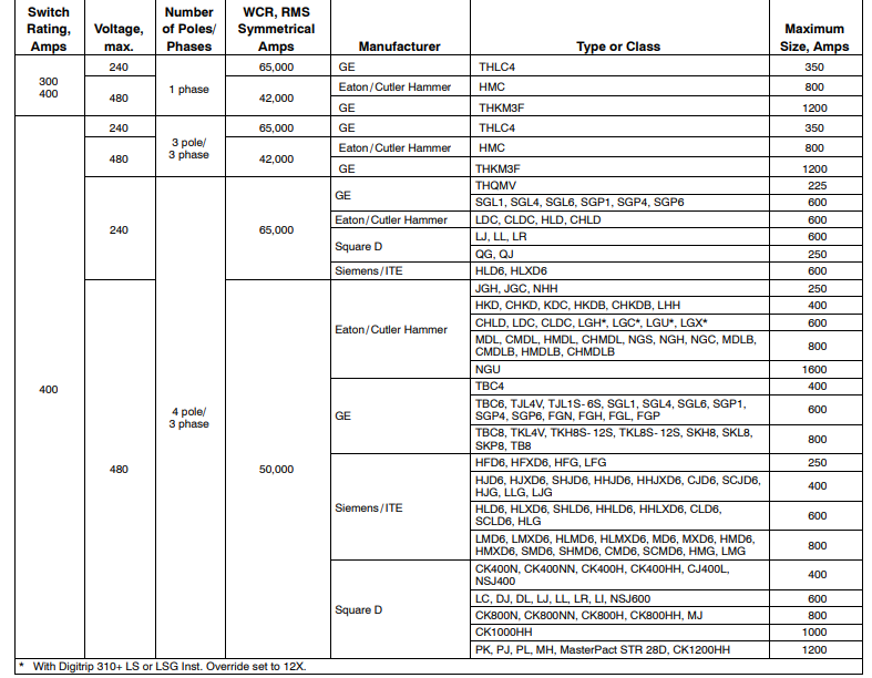 The following table lists contactor withstand current ratings (WCR) for 100- 400 ampere non-service entrance rated switches with specific manufacturer’s circuit breakers per UL and Canadian safety standards.