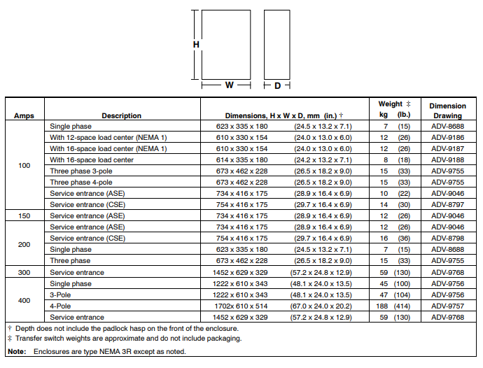 - A: NEMA 1 * C: NEMA 3R * NEMA 1 enclosure is available on 100 amp load center models only. Current Rating Connections A: No load center B: With load center (100 amp single-phase only)
