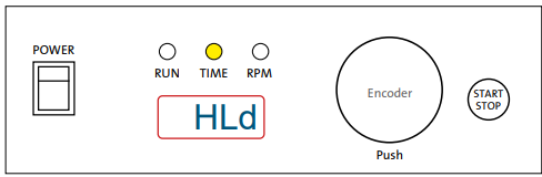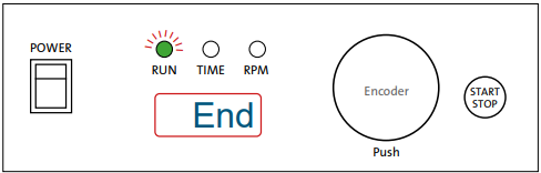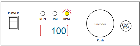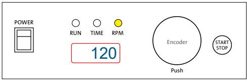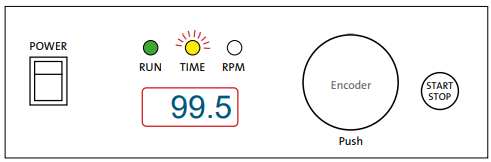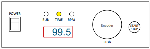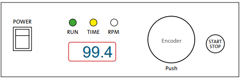 - ENCODER – By rotating the encoder right (+) or left (-), you can change the set TIME or RPM. Push the encoder to switch between TIME and RPM set values. If you rotate the ENCODER knob fast, then the numbers go up or down on the display very quickly.