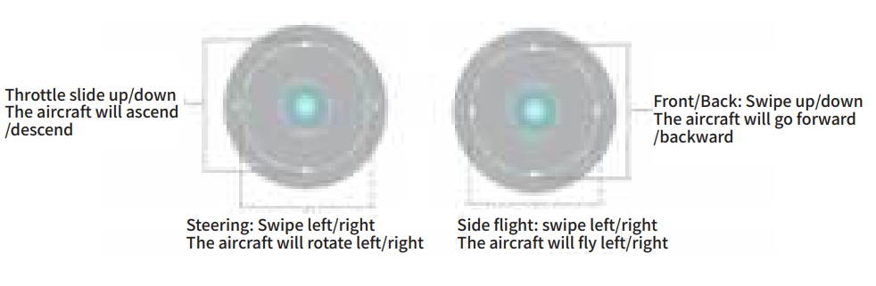 Gravity Sensing Mode: When the aircraft is successfully connected to the mobile APP, turn on the gravity sensing mode and tilt the phone to control the aircraft to fly forward, backward, left, and right.