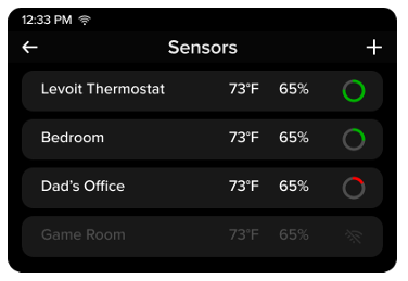 Use the Sensors screen to view the thermostat sensor and additional sensors (sold separately). View the sensors’ current temperature, humidity reading, online status, and remaining battery life. Room sensors can help eliminate hot and cold spots, prioritize certain rooms, and be used with routines. Sensors must be paired to your thermostat through the VeSync app. Add the thermostat and room sensor to the same VeSync Home, and the sensor will automatically pair with the thermostat. To buy official Levoit room sensors, contact