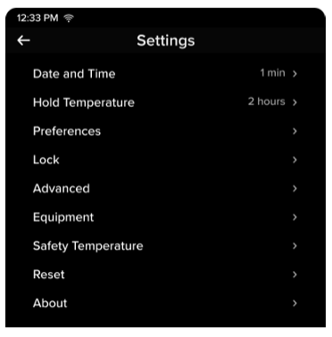 Use the Settings screen to customize additional settings for your thermostat, such as screen brightness, temperature unit, display lock, and more.