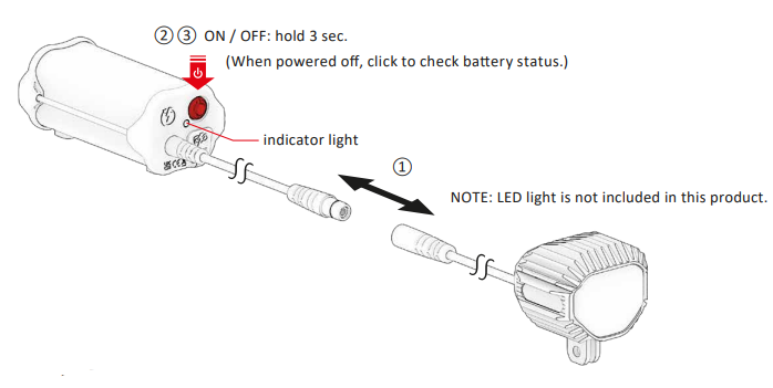 3. When the LED light is not in use, hold the Power Pack XL power button for 3 seconds to POWER OFF. (When the Power Pack XL is powered off, the LED light will turn off, Power Pack XL indicator light will turn off.)