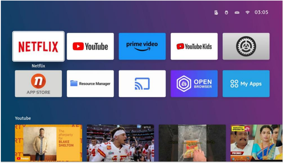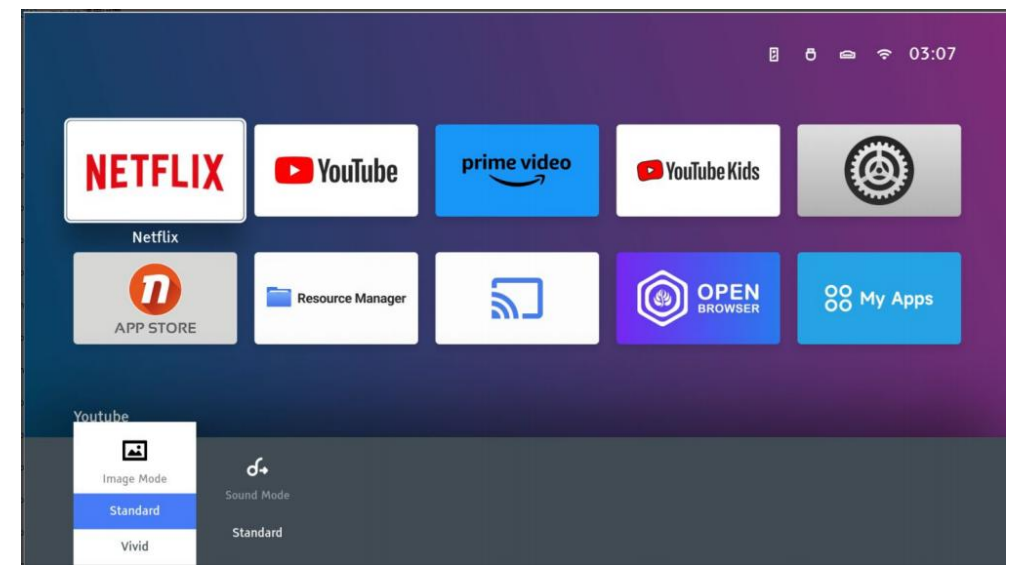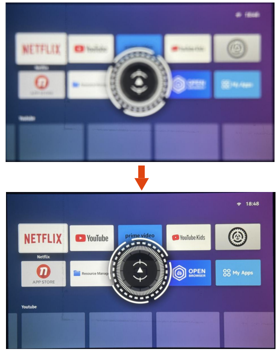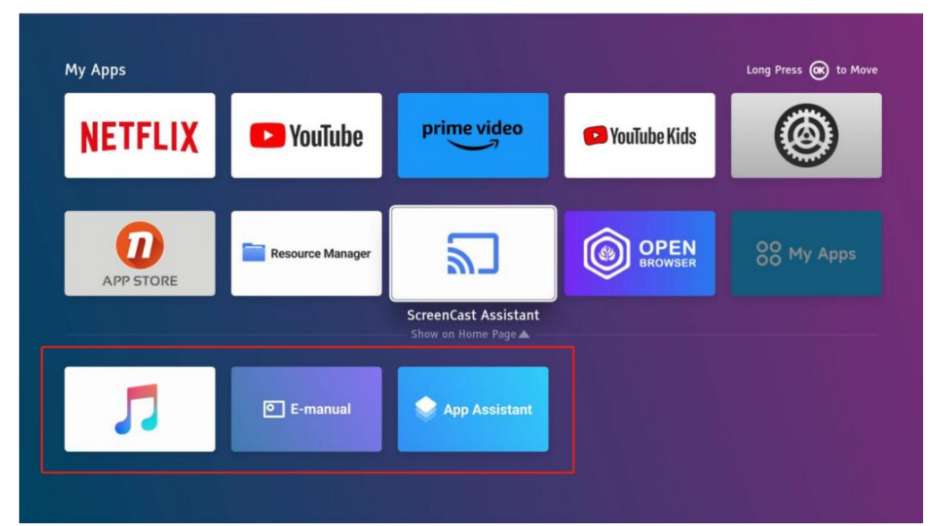 Press and hold the OK button on the remote control to enter the application in moving mode. You can rearrange frequently used icons according to your preference.
