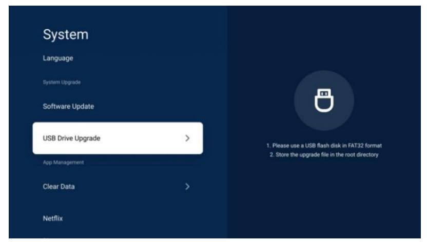 Select Settings->System->USB Drive Upgrade from Home Page, and it will automatically do the updating process after a few minutes.