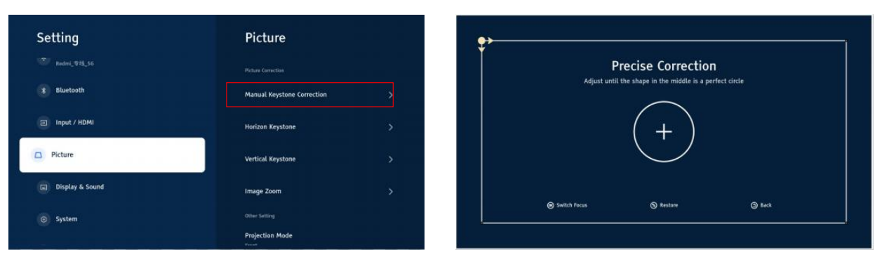 Go to the Picture Setting-Manual Keystone Setting, Press the “OK” button to go to the 4P Keystone Correction Setting Page. Press the arrow keys to adjust the 4 corners of the picture and press the OK button to skip to the next corner.